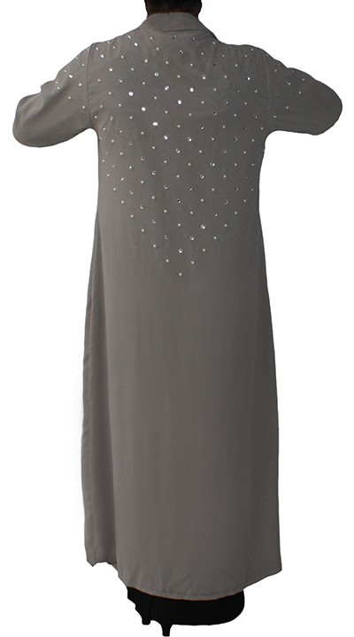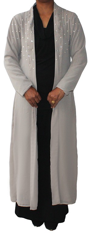 A stylish designer abaya with hand pasted pearls and diamonds double layered georgette kaftan with the front open.